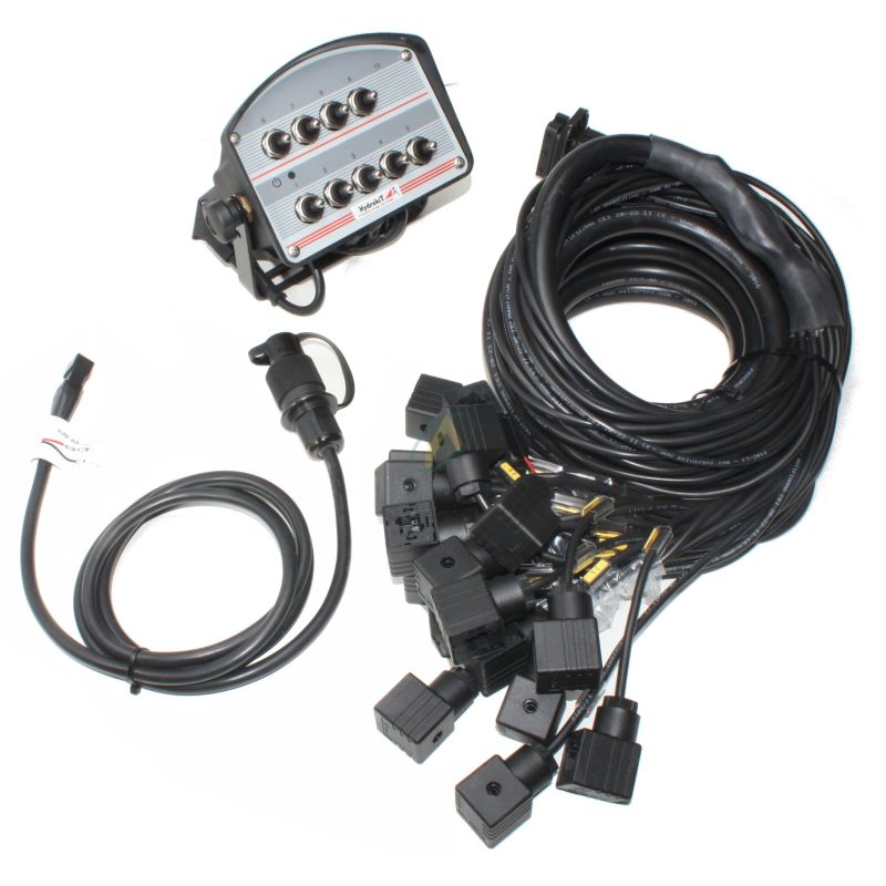 Le boîtier est équipé d'un câble d'alimentation de 2 mètres avec prise à 3 plots et d'un faisceau équipé de prises Hirschmann de 5 mètres pour la connexion aux bobines. Si besoin, nous proposons en accessoire complémentaire une rallonge pour le faisceau de prises.