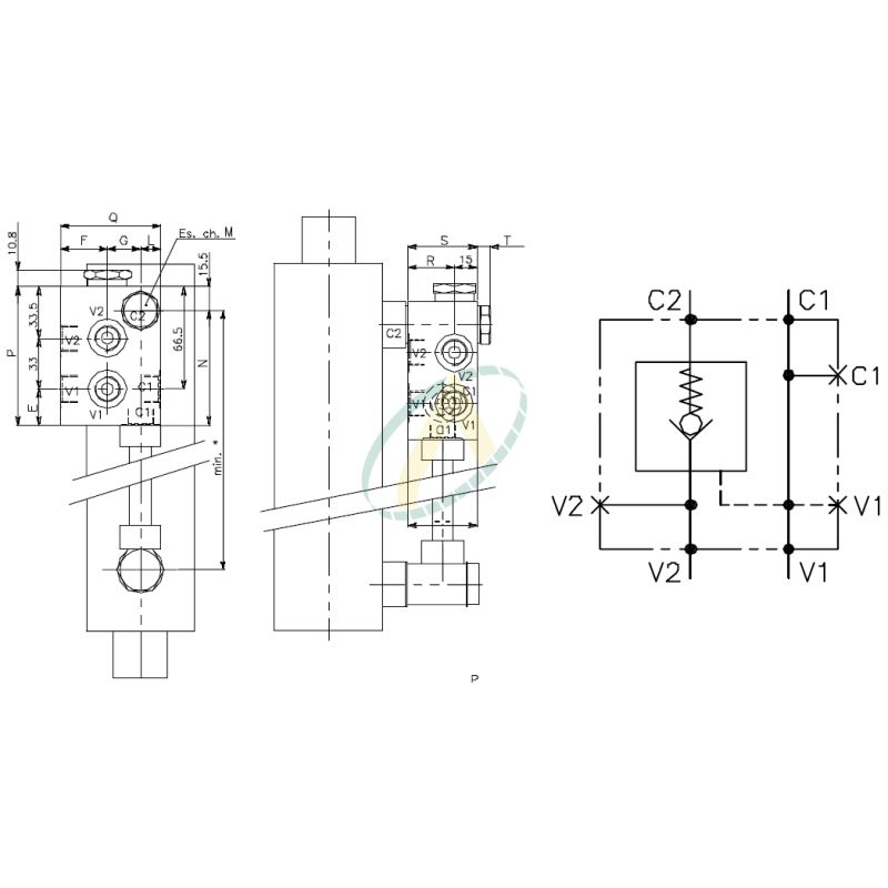 | Type valve | Implantation vérin | Pression maxi (bar) | Rapport pilotage | Débit maxi (l/min) | Ø passage banjo/vis | E | F | G | L | M | N | P | Q | R | S | T |