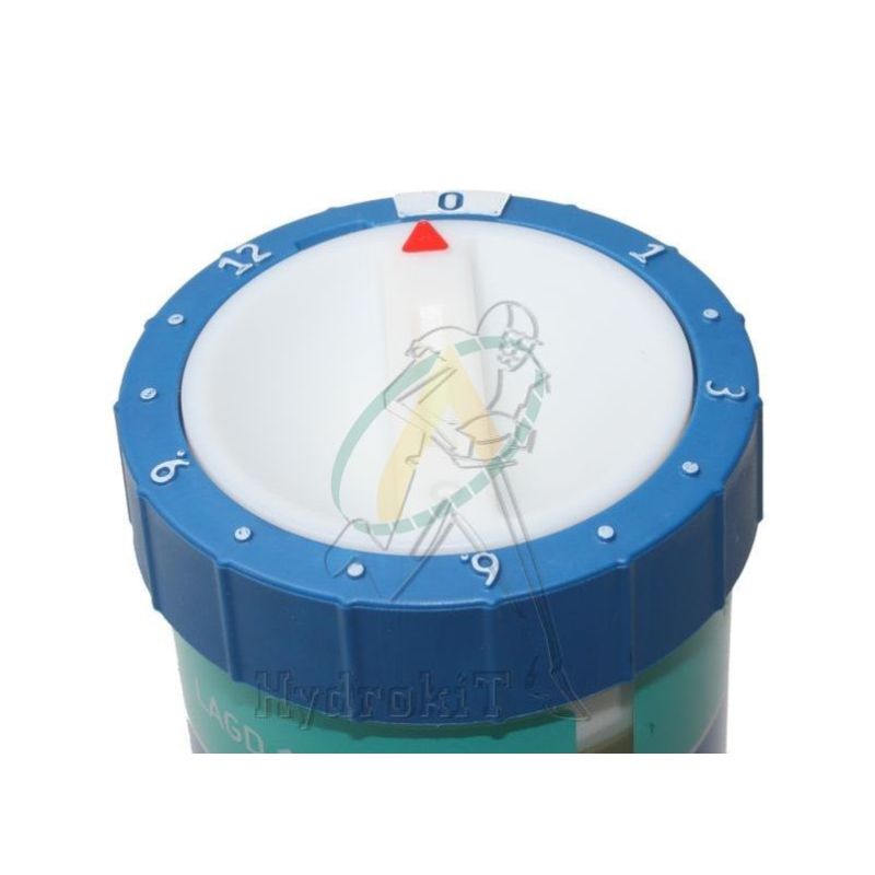 Il suffira de tourner le bouton sur le dessus de la cartouche pour choisir combien de mois doit durer celle-ci. La graisse sors par un orifice en 1/4 BSP à 5 bar et cela par le mécanisme d'une pile à gaz inerte.