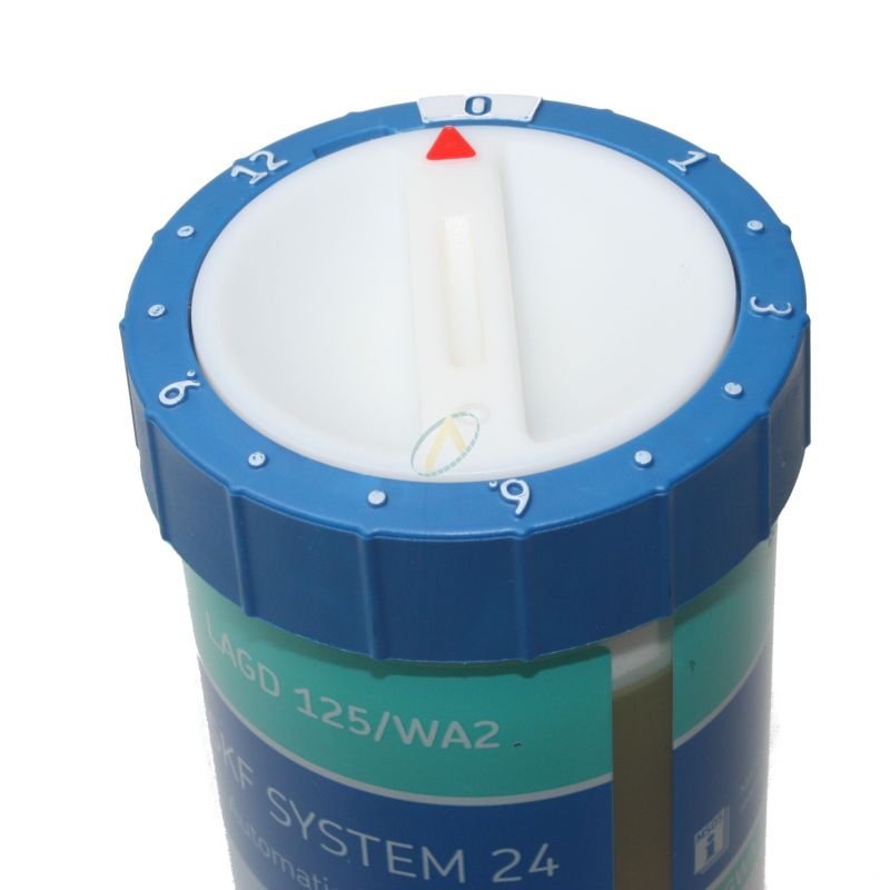 Il suffira de tourner le bouton sur le dessus de la cartouche pour choisir combien de mois doit durer celle-ci. La graisse sors par un orifice en 1/4 BSP à 5 bar et cela par le mécanisme d'une pile à gaz inerte.