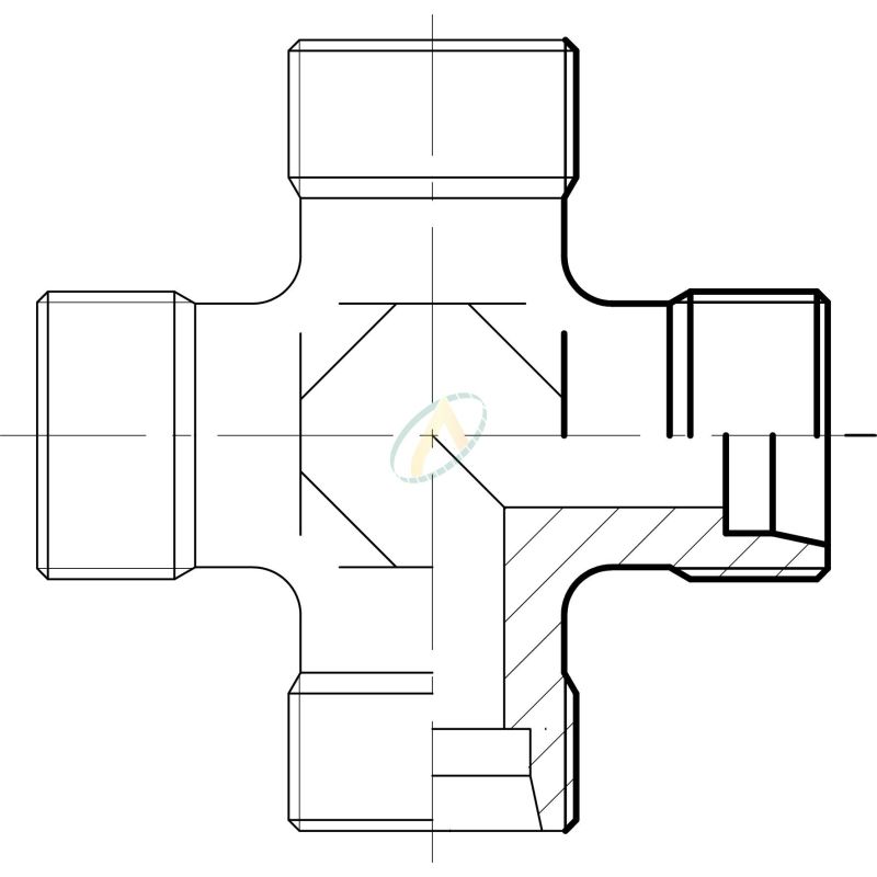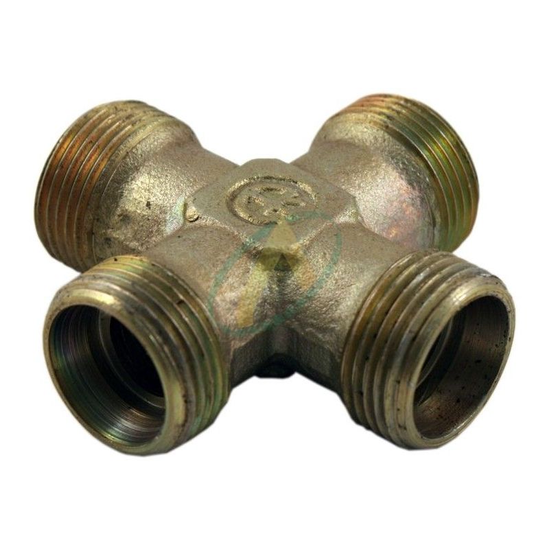 Raccord hydraulique en croix, avec quatre côtés mâle 12S DIN pour connecter un flexible avec embout écrou tournant ou un tube.