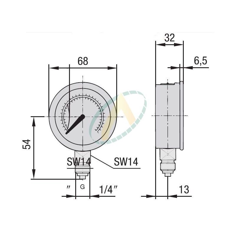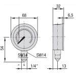 Référez-vous au schéma et au tableau ci-dessous pour avoir toutes les caractéristiques détaillées de votre manomètre hydraulique prise verticale de diamètre 63 mm :