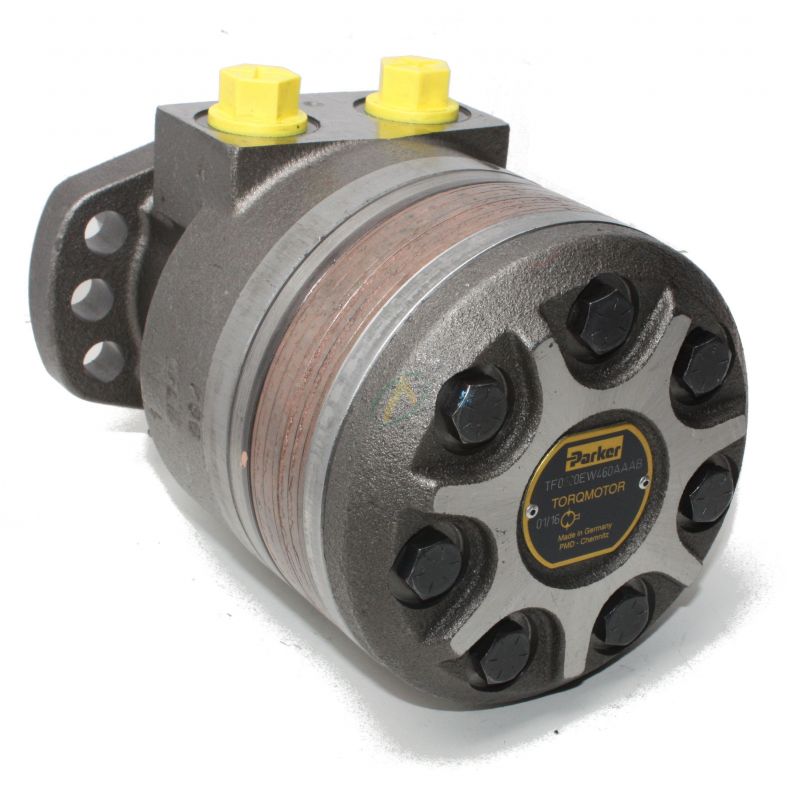 Moteurs hydrauliques de type OMH de la marque Parker. Ce moteur orbital possède un arbre cylindrique de diamètre 32 mm avec une flasque de fixation en 6 trous et une cylindrée de de 80 cm3.